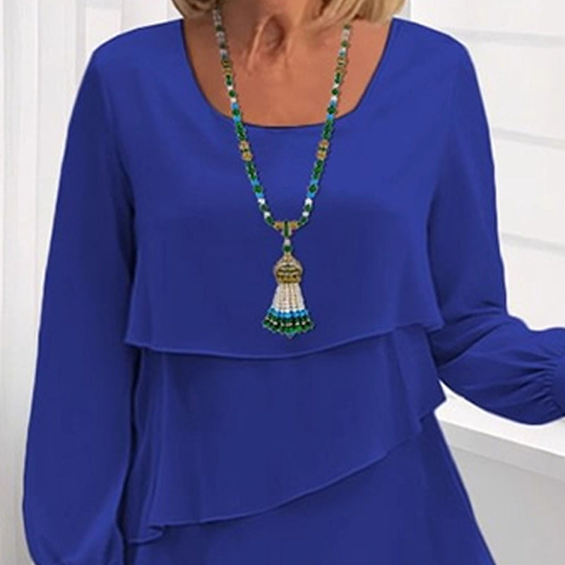 ELEGANCKIE WARSTWOWE WZORNICTWO – Sylwetka z kaskadowymi falbanami dodaje objętości i płynności. Doskonale zakrywa brzuch, jednocześnie nadając mu atrakcyjny kształt i zapewniając wyrafinowany ruch.
