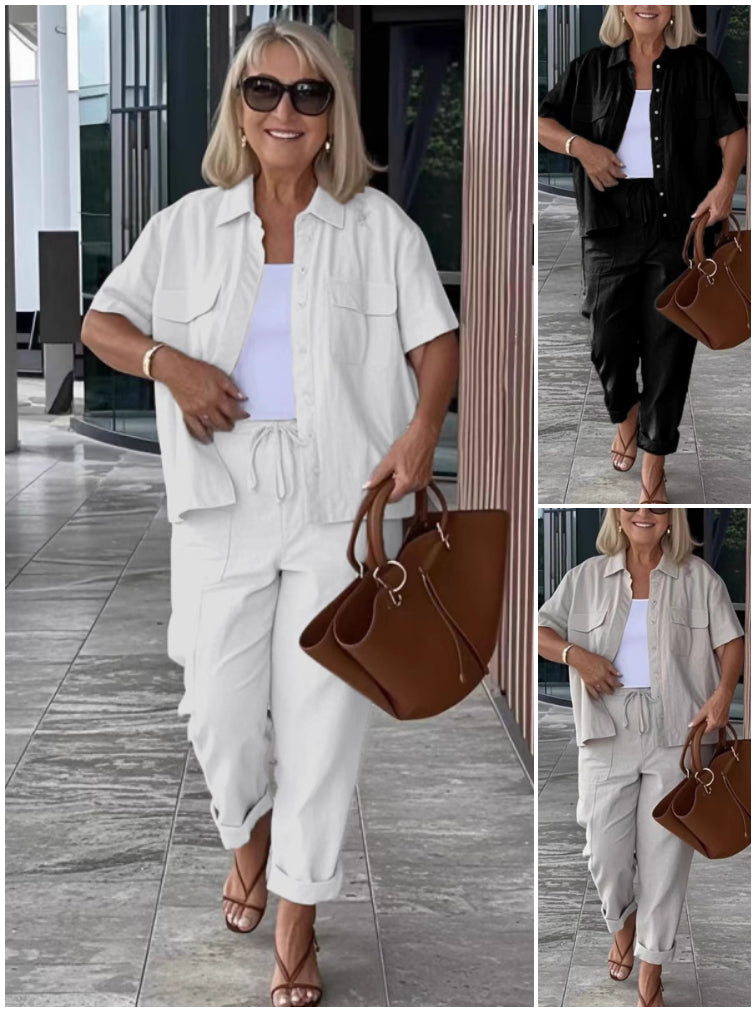 Zestaw zawiera 1 x bawełnianą i lnianą koszulkę z krótkim rękawem i luźne spodnie